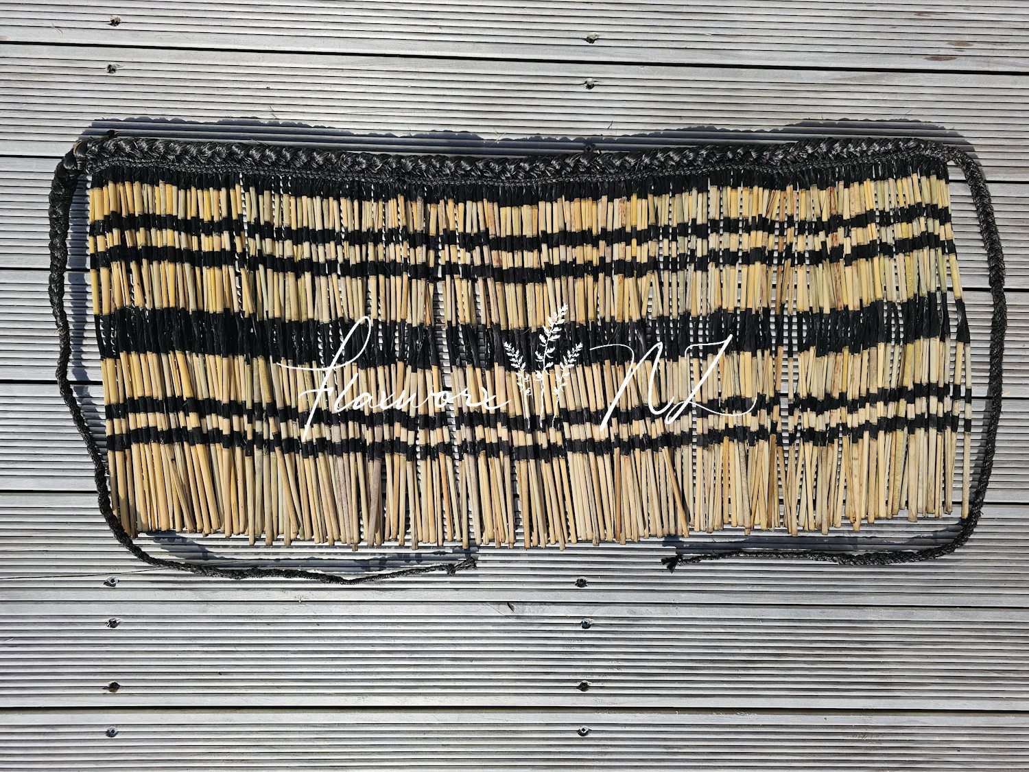 They are made from a specific type of Harakeke (NZ Flax), which is different from the varieties we use for kete, pikau, or other “woven” items. The fresh leaf is first cut on the dull side on a pattern board. Then the front (shiny/waxy) membrane is scraped off (haro) with a mussel shell to reveal the underlying muka (fibre). Next, they get boiled and left to dry, curl, and bleach (closely watched so they do not curl up into each other). When we have enough pokinikini (strips) for a specific size, we whatu them (put them together using either muka or jute string), and then they get dyed to reveal the pattern.
