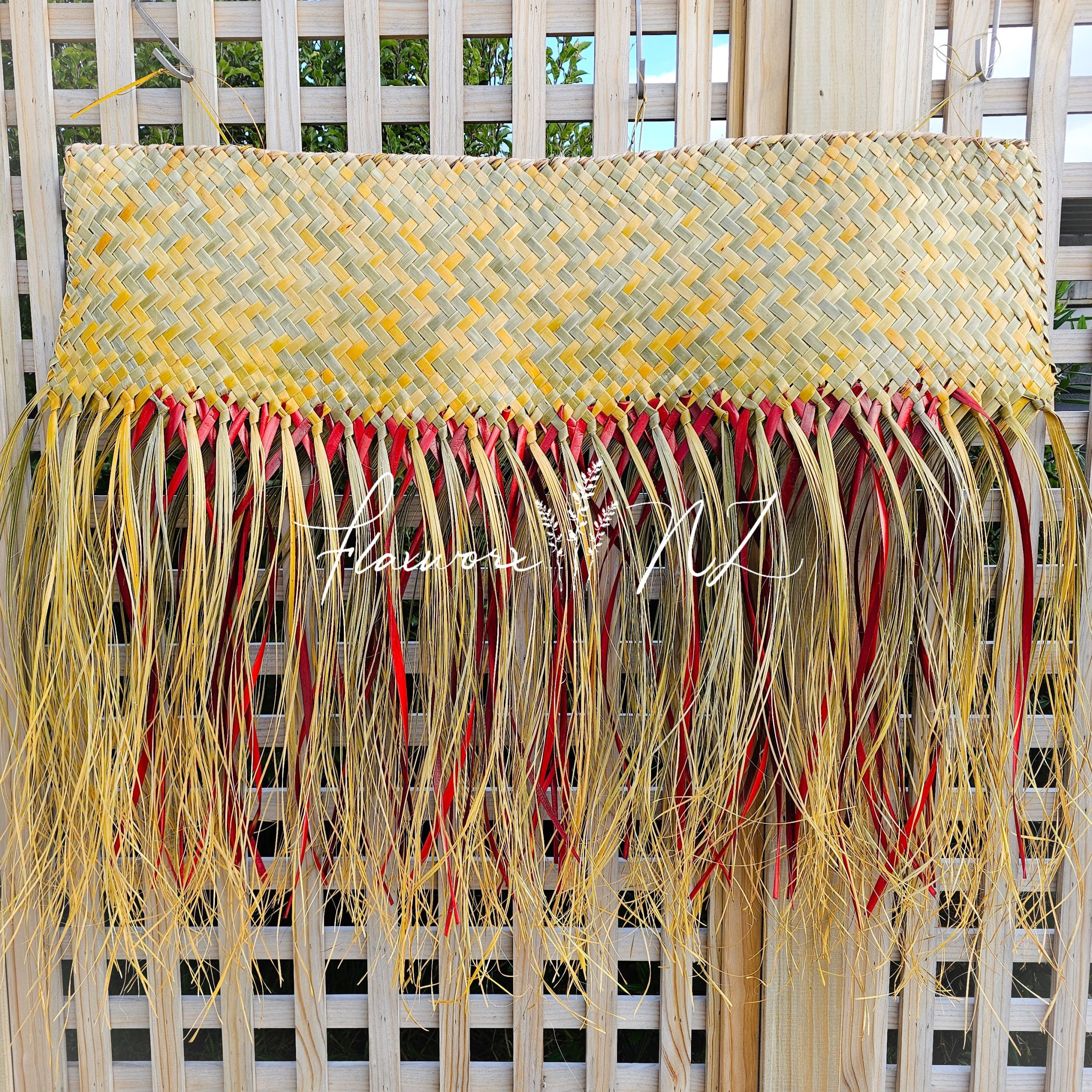 This wall hanging has been hand-woven from mostly natural harakeke (Phormium tenax), showcasing the diverse shades of its different varieties and accentuated with just a few separate whenu (strips) of Red (dyed) harakeke to give depth.